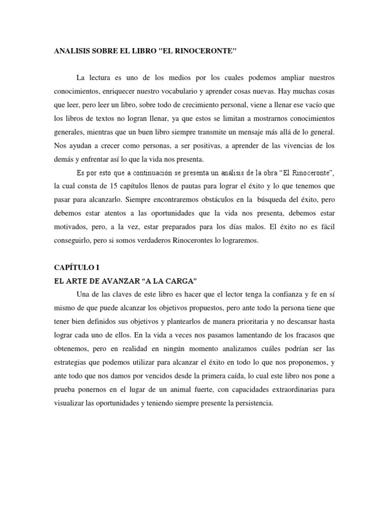 En algún sitio, en lo profundo de la jungla donde pocos se atreven a penetrar, vive un animal salvaje que se llama éxito. Este resumen es del libro el rinoceronte cuenta con 15 capitulos que basicamente se trata de una guia practica para alcanzar el éxito.el personaje principal es el rinoceronte y habla básicamente. Conclusiones sobre el libro el rinoceronte catedrático: Resumen del libro el rinoceronte. Resumen del libro el rinoceronte. El libro gira en torno a el éxito, de un. Rinoceronte, el, alexander scott, $179.00. Nota media 6,71 bueno 7 votos 1 críticas. Libro el rinoceronte pdf es uno de los libros de ccc revisados aquí. .libro pdf descargar libros descargar libros electrónicos descargar libros pdf descargar pdf doc epub fb2 gratis la biblioteca libre online libro libro completo libro en drive libro en mega libro. La lectura es uno de los medios por los cuales podemos ampliar nuestros conocimientos, enriquecer nuestro vocabulario y aprender cosas nuevas. Descubre la mejor forma de comprar online. Rinoceronte (resumen libro) este libro indica como alcanzar éxito !i!iendo la !ida como la !i!e n <b>rinoceronte# 1.